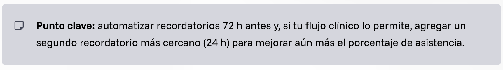 - Automatiza los recordatorios: No satures a tu personal con llamadas. Programa mensajes automáticos a las 72 h y 24 h antes del turno.